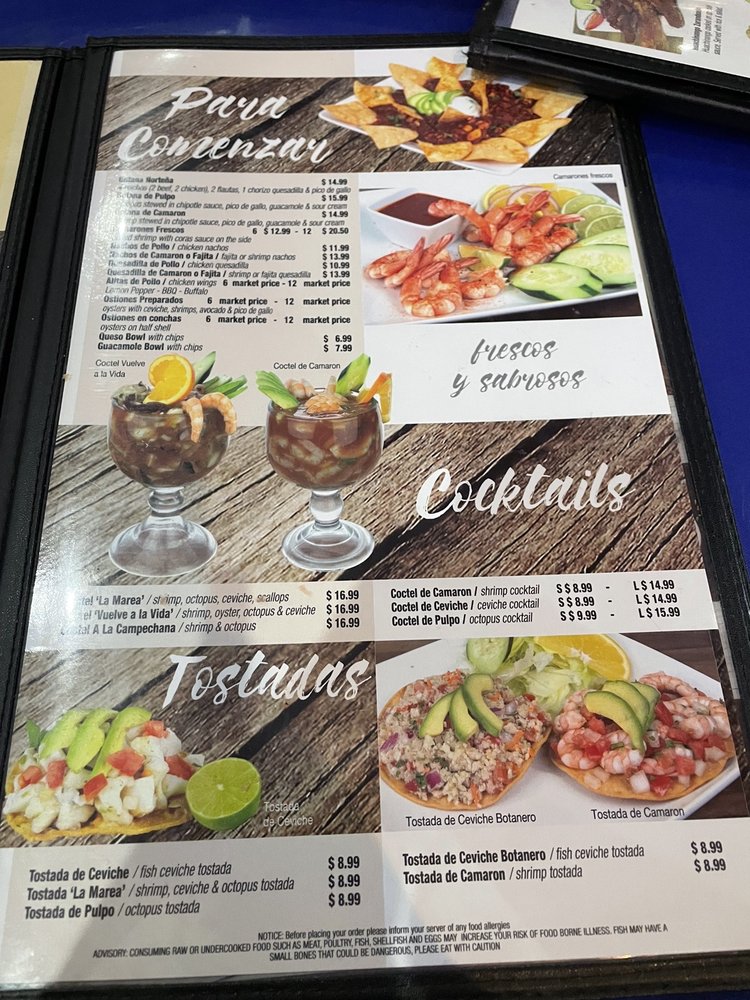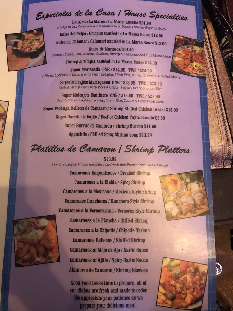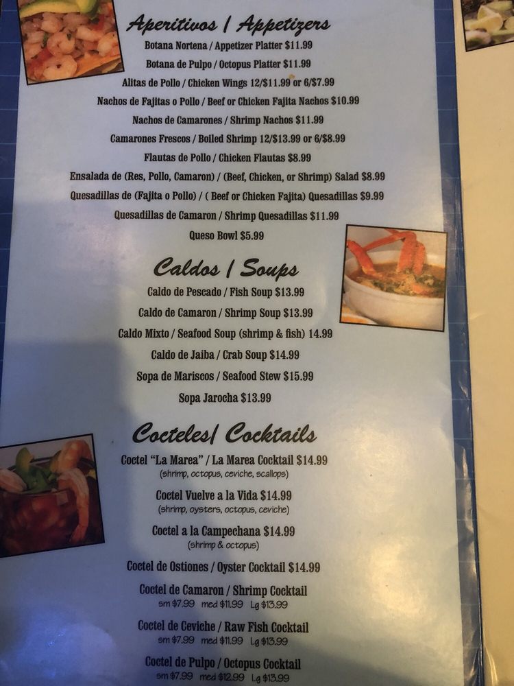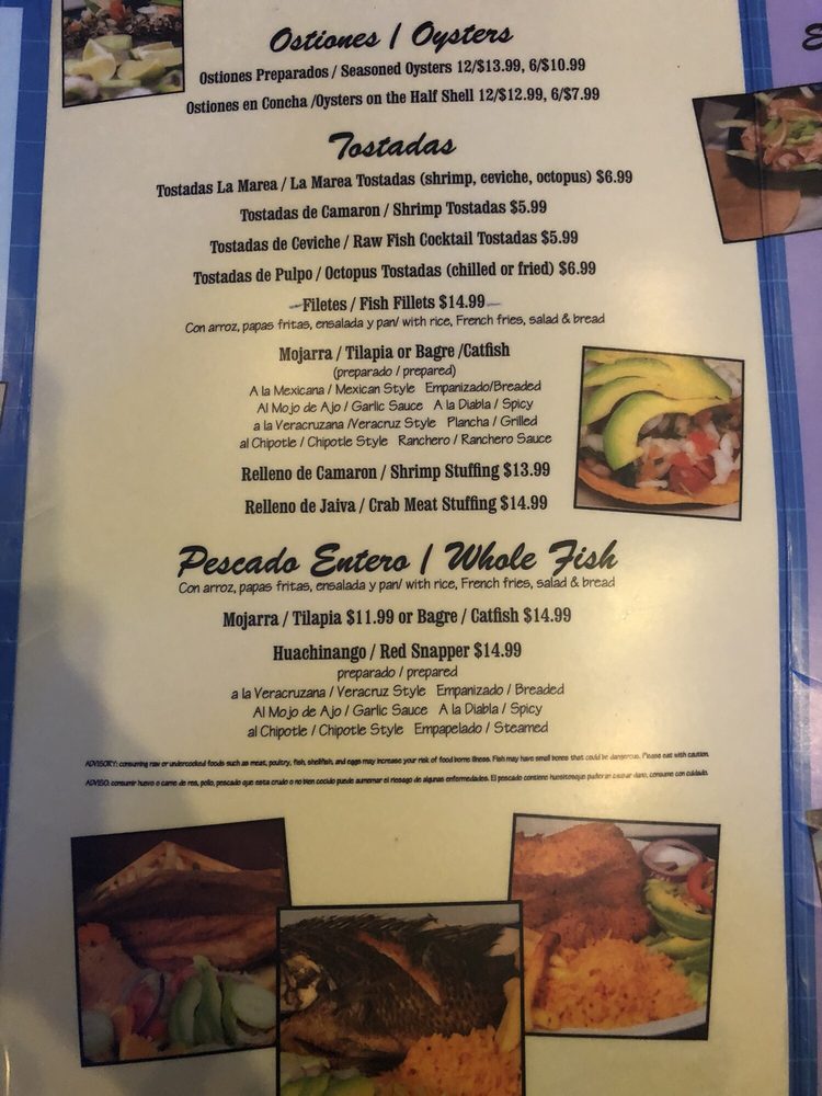 Mariscos La Marea is a vibrant Mexican seafood bar located in Dallas, TX, offering a diverse menu and a lively atmosphere. The lunch menu features a variety of options, from Enchiladas to Fajitas, catering to different tastes. A standout dish is the Camarones al Aguachile, showcasing shrimp cooked in a zesty lemon sauce with fresh vegetables. The Especiales de la Marea present unique dishes like Las Cucarachas and Camarones Endiablados, promising a flavorful experience. The authentic preparation and exceptional flavors, as highlighted by satisfied customers, make Mariscos La Marea a must-visit for those craving an authentic Mexican dining experience. Don't miss out on their cocktail options and happy hour specials, adding to the overall enjoyable dining experience.