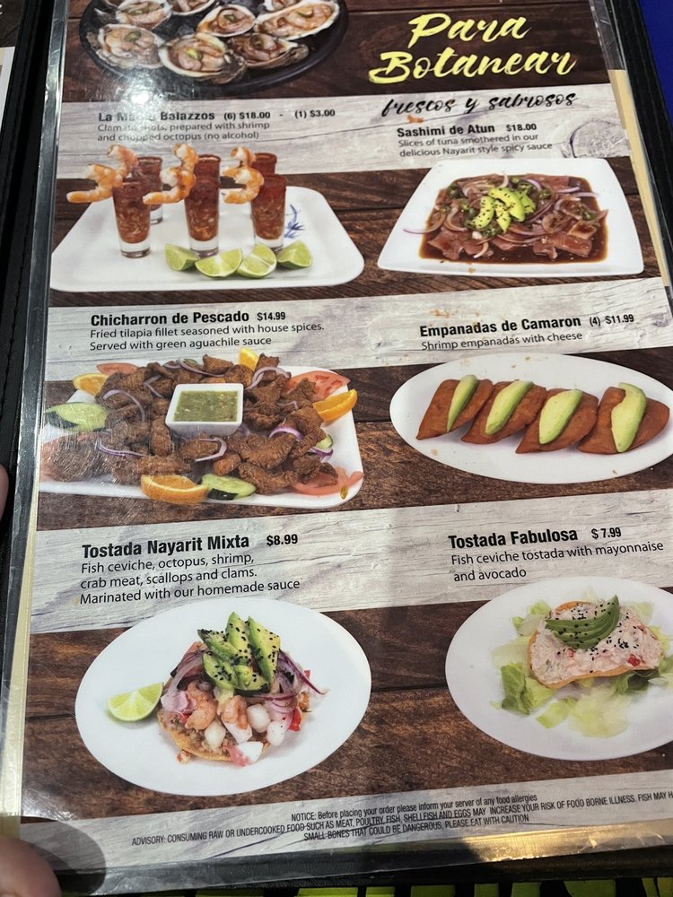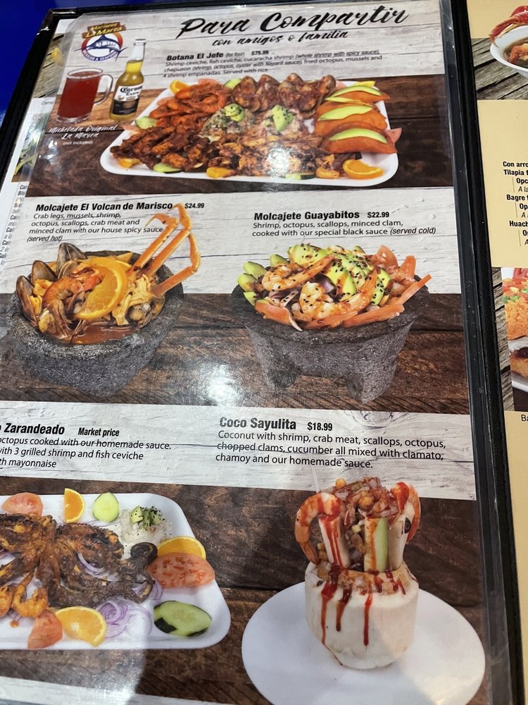 Crab legs, mussels, octopus, crab, little clam, scallops, whole shrimp and shell shrimp. Cooked in our nayarit sauce.